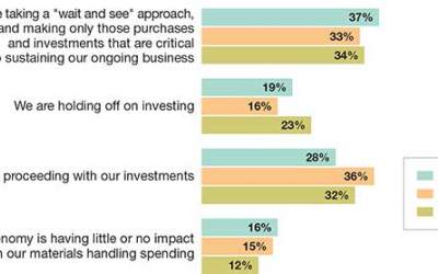 Each year, the survey asks how the present state of the economy is affecting spending on material handling systems and related technologies. Compared to last year’s findings, there is more hesitancy. Last year, 23% said that they were “holding off” on investing, up 7% from last year’s 15%. Only 12% said the economy is having little or no impact on their spending plans, versus 15% last year.