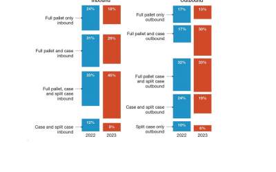On the outbound side, 12% say they deal with full pallet only, down from 17% in 2022, while 30% ship out full pallet and case, up from 17% last year. Meanwhile, 33% said they ship a mix of full pallets, cases, and split case, up just 1% from last year; 19% ship case and split case, compared to 24% last year; and 6% do split case only outbound, down from 10% last year.