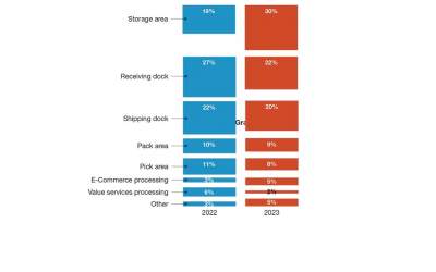 The “most congested” area of the warehouse this year was storage, with a 30% response, up from 19% last year, followed by receiving (22%) and shipping (20%). Last year, 27% named receiving as the most congested area.