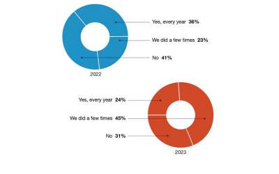 The survey also asks if, within the past five years, the operation leased additional space during peak times. This year, 24% say yes they have every year, down from 36% last year; 45% say they have a few times, up from 23% among last year’s respondents, while 31% say no, down from 41% last year.