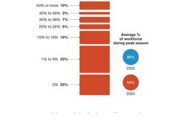 When it comes to the percentage of workforce who are temps during peak, the average this year was 14%, down from 20% in 2022—and also below the 2021 average of 18.3%. Still, 10% indicate that 50% of the workforce were temps during peak, though a quarter indicate that they didn’t use temporary labor at all during peak.
