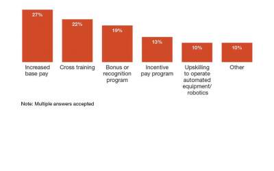 In terms of retention improvement practices (multiple answers permitted), the leading practice was increased base pay, at 27%, followed by cross-training at 22%; bonus or recognition programs are used by 19%; incentive pay used by 13%; and 10% view placing workers into upskilled positions working with robotics or automation as a retention practice.