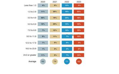 This year, respondents had an average capex projection of $1.15 million for the coming year, down just a hair from last’s year’s average projected capex of $1.17 million. The median actually rose a bit, from $360,500 last year, to $367,250 this year. Looking at budget ranges indicated for 2023, just over one in four (26%) are planning to spend $1 million or more on equipment and technology this year.