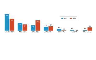 While wholesale continues to be the top channel serviced, named by 55% this year, 36% of respondents this year say they are involved in e-commerce fulfillment, while 30% say they have omni-channel responsibilities, 1% higher than last year. Those saying they have an e-commerce channel was down by 5% versus last year’s 41%; but at the same time, there was a slight increase in those saying they’re involved in micro-fulfillment delivery to customers—19% this year, up from 15% in 2022.
