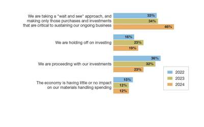 Each year, the survey asks how the present state of the economy is affecting spend on materials handling systems and related technologies. And in this year’s survey, 46% say they are taking a “wait-and-see” approach, up from 34% last year.