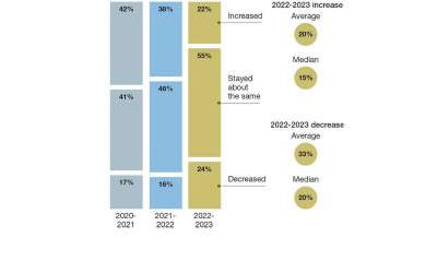 When asked how company spend on materials handling solutions in 2003 compared with 2022, 22% say it increased, down from 38%. Another 55% this year say their 2023 spending “stayed about the same” versus the previous year, whereas last year, 46% answered it stayed level.
