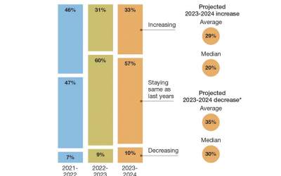In terms of 2024 spending on materials handling solutions compared to 2023, 33% are predicting higher spend, up from 31%. The majority answer was again “staying about the same,” with a 57% response.