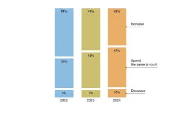 The survey also asks if spending will increase over the next two years to three years, and here caution also prevailed. In particular, 47% predict their companies will spend the same amount on systems over the next two to three years, up from 42%. Those forecasting an increased level stood at 43%, down from 49%.
