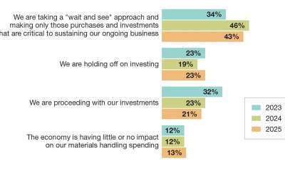 Economic conditions appear to be impacting spending on materials handling equipment, technologies, services and solutions. While 34% of companies say it’s “business as usual” on the investment front, 43% of respondents say they are taking a “wait-and-see” approach, and 23% are holding off on investing altogether.