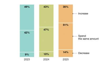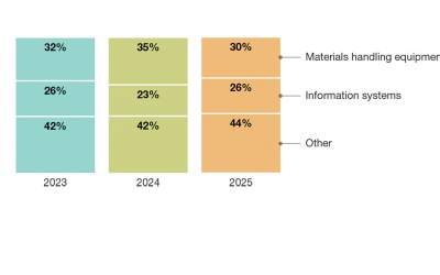 Over the next two to three years, 35% of respondents expect their materials handling equipment and related information systems spending to increase, 51% say budgets will remain steady, and 14% plan to spend less in this area.