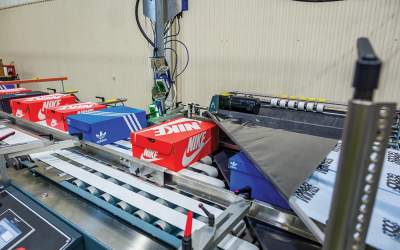 The CMC CartonWrap machine rapidly creates custom shipping cartons from fanfold-fed corrugated cardboard, right-sized to fit around the shoeboxes being shipped to fill single-line orders. The system also automatically applies the shipping label.