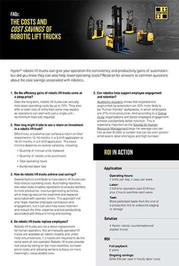Hyster® robotic lift trucks can give your operation the consistency and productivity gains of automation, but did you know they can also help lower operating costs? Read on for answers to common questions about the cost savings associated with robotics.
