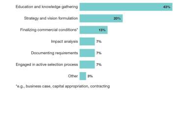 Asked to describe the current state of their organizations’ warehouse robotics initiatives, 43% of companies are in the education and knowledge gathering stage; 20% are in the strategy and vision formulation stage; and 13% are finalizing their business cases and capital appropriation. Others are in the process of impact analysis (7%), documenting requirements (7%) or are engaged in the active selection process (7%).