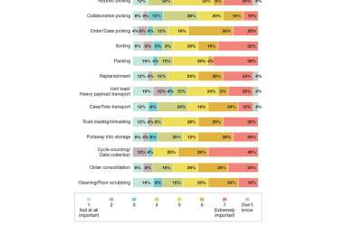 The modern warehouse is a complex animal where cycle counting and data collection (40%), packing processes (36%), sorting (32%) and truck loading and unloading (28%) are all processes that are ripe for improvement. Twenty-four percent of companies see robotic picking as being extremely important, while 24% want to improve replenishment processes, and an equal number want better than 24% order consolidation processes.