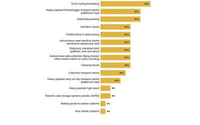 Over the next two to five years, companies say they’ll be most interested in sortation robots (33%), robotics picking systems (33%), robotic cube storage systems (29%) and case/tote transport robots (25%).