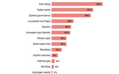 Typical “greening” initiatives and strategies most prominently mentioned were captured in the survey. Of note, each of the three leading tactics—trailer skirts, speed governance and anti-idling—maintain significant penetration, not to mention top billing for the past four years.