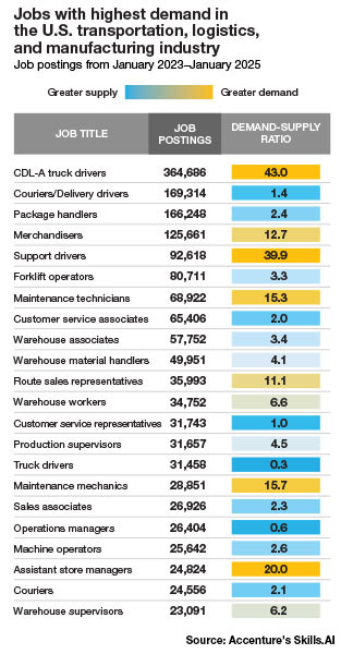 Labor shortages and the changing demands of the younger generation: Labor shortages are among the most pressing issues for logistics companies. Accenture research shows that in transportation, the top jobs with the highest demand continue to be CDL-A truck drivers and support drivers with respectively 43 and 40 open job postings for every existing driver.