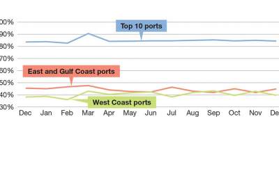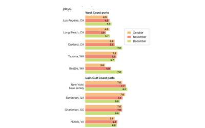 Jones notes that Gulf Coast ports had their volume negatively affected in November, but the volume bounced back in December. “However, port transit time delays did increase by two days in December,” he says. But issues with the Panama and Suez Canals and more labor contract negotiations may see those gains slip away, he warns.