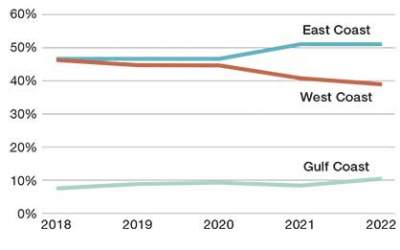 On the Gulf Coast, primarily Port Houston, Global Port Tracker reports that import volumes remained high throughout 2022 with double-digit percentage year-on-year growth through October. The coast ended the year with a 17.3% increase in loaded imports and an 18.7% increase in loaded exports. “Like East Coast ports, the Gulf Coast benefited from the cargo diverted from the West Coast and shifts by shippers to diversify supply chains,” says Hackett.