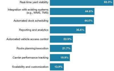When shopping for solutions that can address these and other yard-related challenges, 63% of organizations want systems that provide real-time yard visibility; 45% want platforms that integrate with their existing systems (WMS, TMS, etc.); and 44% want access to capabilities like automated dock scheduling, according to the survey.